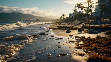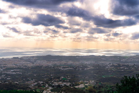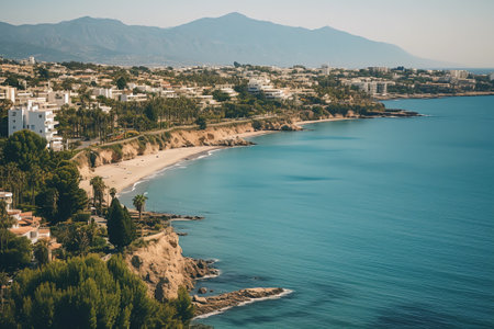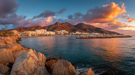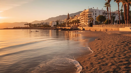 Generative AI : Aerial view of Marbella a small city along the Mediterranean Sea coastline at sunset Malaga province Andalusia Spain