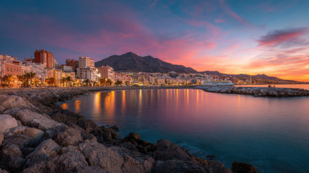 the morning glow of the sunrise hiting the city in benalmadena spain