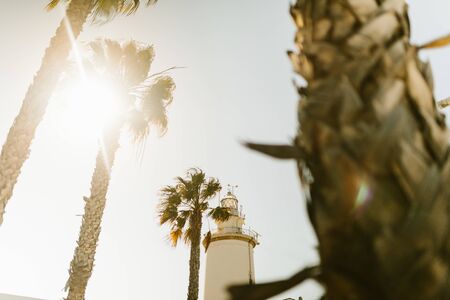 La Farola Malaga (the lighthouse) with palm tree and sun at sunset