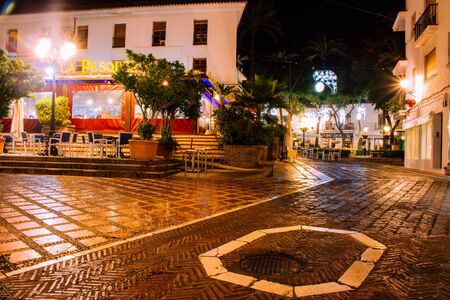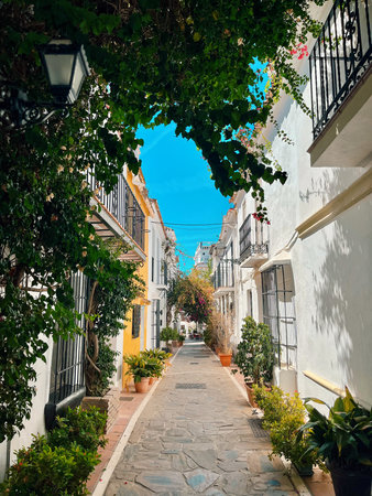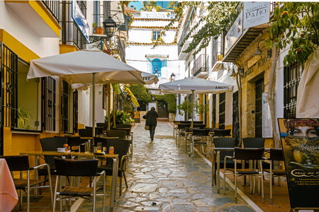 Marbella, Malaga, Spain - November 4, 2023: City streets of Marbella in Costa del Sol, Spain. The Old Town, iconic streets in Marbella and major tourist attractions with shops and bars at city centre