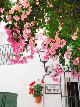 Typical street of the Andalusian white town, Spain, with flowerpots and bougainvillea, located in Mojácar, AlmerÃa. You can see the street name `calle Enmedio` that means` middle street`