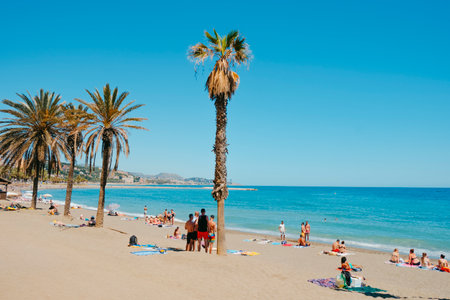 Malaga, Spain - May 26, 2022: People enjoying the good weather in a sunny spring day in La Malagueta beach, in Malaga, Spain