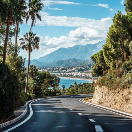 A vibrant street showcases charming buildings in hues of orange and blue, framed by palm trees, leading down to a sparkling Mediterranean sea under a clear sky.