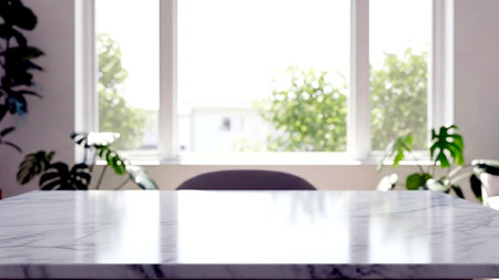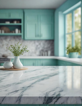Generative AI Realistic 3D render blank empty space on granite kitchen counter top by the window wit