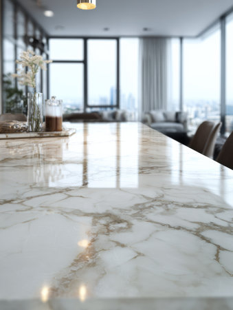 Bright and airy room with a polished marble countertop and a beautiful city view, creating a tranquil living space.