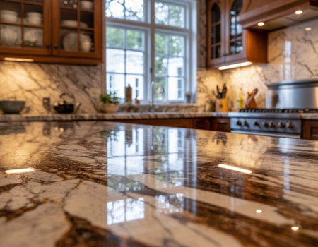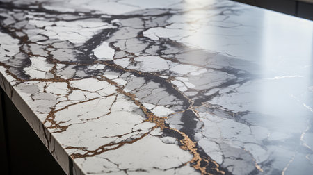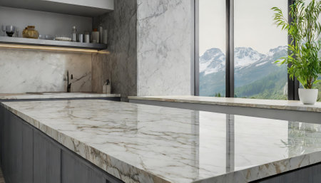 A detailed view of a sleek marble granite kitchen counter island set in a modern, bright, and clean environment, ideal for product displays or enhancing the appeal of sophisticated home decor