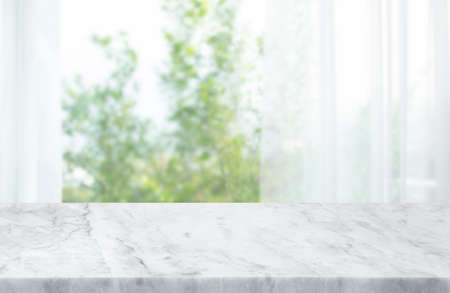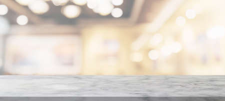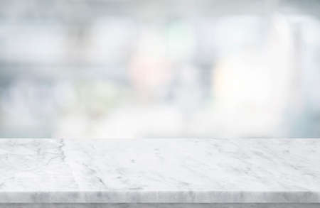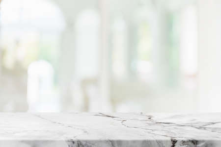 Empty white marble stone table top and blur glass window interior cafe and restaurant banner mock up abstract background - can used for display or montage your products.