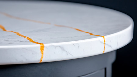 A close-up view of a white marble tabletop with visible grey veining and golden kintsugi repairs. The tabletop is round with a smooth, polished surface. The golden lines highlight the cracks.