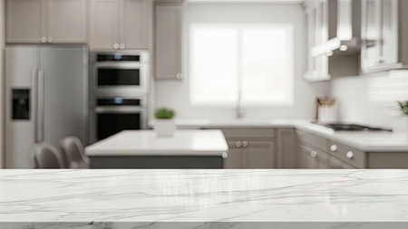 Empty marble countertop kitchen with copy space over kitchen background.for product display montage. AI generation.