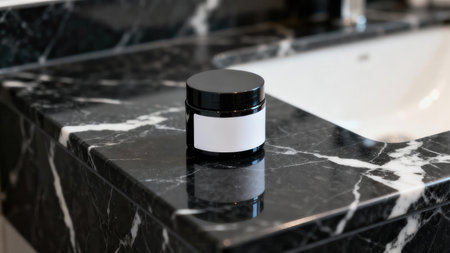 Close up shot of black cosmetic packaging jar with a white paper label mockup resting on a highly reflective black marble vanity surface with white veining.
