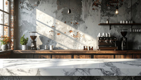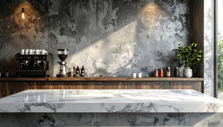 3d render of white marble kitchen countertop with coffee machine in loft style