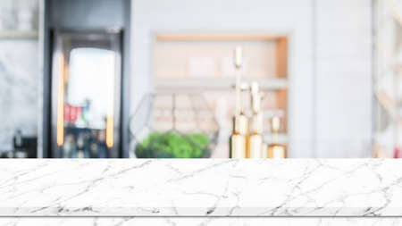 Empty white marble countertop and blurred kitchen interior background, product display montage