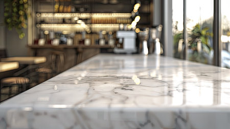 top table with bokeh light blur in a restaurant, featuring a marble empty table in front of a blurred background