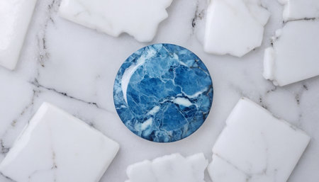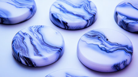 This image showcases round coasters with an elegant marbled design in shades of blue and white, perfect for enhancing any table setting or decor.