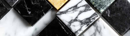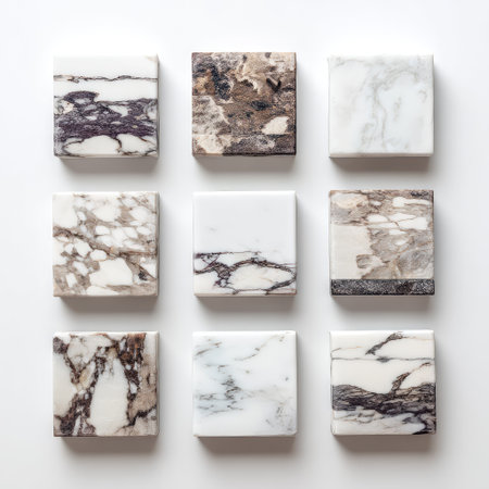 A stylish shot of square marble samples laid out on the table, showcasing different colors and patterns for interior design and flooring. The focus is on creating an elegant composition with natural stone material, emphasizing texture and color contrast in each block. --ar 3:2 --stylize 750 --v 6.1 Job ID: eb23c9a0-3456-47e4-9ec6-9e1f1f6d8681