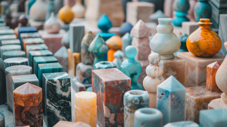 A collection of colorful marble sculptures in various shapes and sizes, creating a visually appealing and artistic display. Ideal for themes related to art, decor, and craftsmanship.