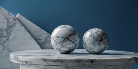 AI Generated. Close-up of a sleek white marble podium with geometric shapes and spheres on a blue background for product demonstration with copy space