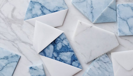 Colorful geometric sculptures made of various marbles displayed on a marble surface.