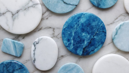 Blue and white marble tiles texture background. Top view. Flat lay.