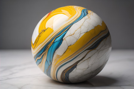Colorful marble ball on a solid colour background. Close-up. ai generative