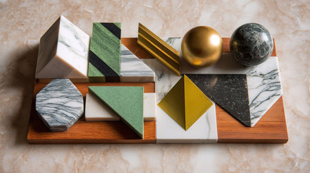 An abstract arrangement displays a variety of textures and colors, featuring stone, marble, and metal elements artistically combined to create a visually stimulating composition.