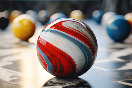 A collection of colorful glass marbles is scattered on a dark surface, displaying unique patterns and textures, evoking a sense of nostalgia and creativity, AI generated