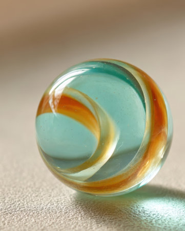 A clear marble sits on a flat surface. The marble has a swirling pattern with blue, orange, and brown colors. Bright light creates reflections and shadows across the surface.