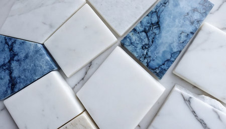 White marble tiles on blue marble background, top view, flat lay