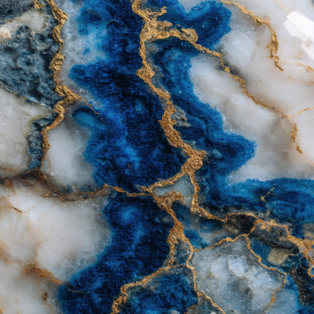 This image presents a close-up of a mineral surface featuring intricate patterns. The composition showcases a vibrant interplay of blue, white, and gold, resembling natural stone. The textures suggest a detailed view of a geological formation. Suitable for designs, backgrounds, and creative projects.