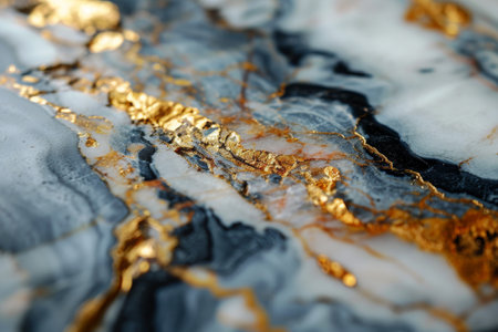 An abstract close-up showcases a luxurious marble texture. White and gold hues dominate, intersected by dark veins. The composition emphasizes organic shapes and patterns, creating a sense of depth and visual interest. Suitable for various design applications, it can enhance commercial and editorial projects.