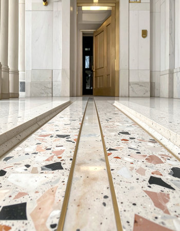 A striking marble floor with golden lines in a spacious hall, beautifully lit by natural light.