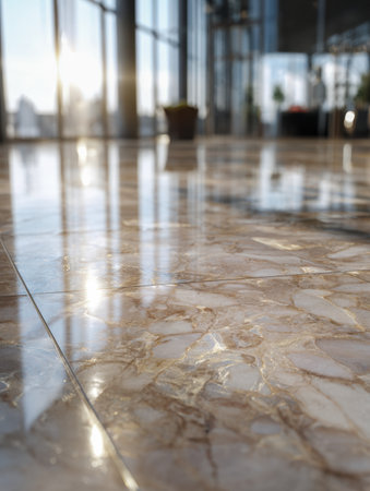 A sunlit interior space features reflective marble flooring and large windows. The image showcases natural light and shadow play. The architecture appears modern and elegant with a minimalist aesthetic. Suitable for advertising, interior design, or lifestyle content.