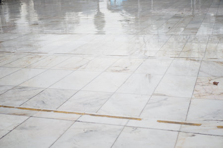 Wet marble floor reflecting light in a quiet indoor space