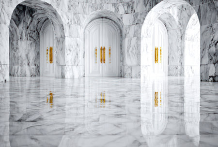 This image showcases a series of white arched doorways within a luminous marble hall. The scene features gold-colored door hardware, with the reflective floor enhancing the symmetrical composition. The overall style suggests an interior setting, possibly offering a sense of luxury. The image could be utilized for various commercial purposes, including architectural or design-related projects.
