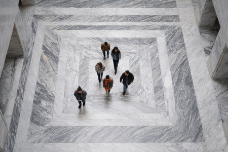 Six individuals are captured from a high angle, walking across a geometrically patterned marble floor. The composition highlights the geometric lines and patterns created by the architecture. The lighting is diffused, giving a sense of openness. The image could be used for architectural or conceptual purposes.