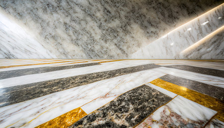 Interior design element featuring highly polished stone walls in various shades of black, gray, and cream, richly detailed with sparkling gold pyrite veins and illuminated by soft architectural...