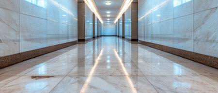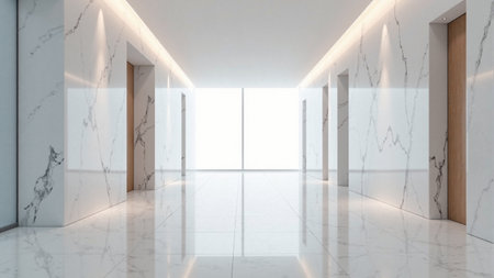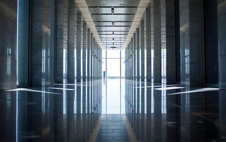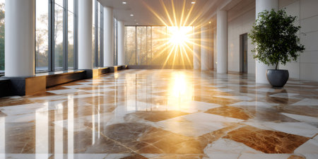 Spacious modern lobby with shiny marble floor reflecting bright sun rays from large windows