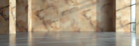 A sunlit interior space features reflective marble flooring and large windows. The image showcases natural light and shadow play. The architecture appears modern and elegant with a minimalist aesthetic. Suitable for advertising, interior design, or lifestyle content.
