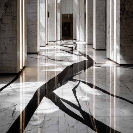An interior perspective features a polished marble floor with black design accents, under soft, ambient lighting. The composition includes vertical pillars with illuminated edges, casting shadows that create depth. Suitable for commercial or design projects, the image conveys a sense of modern elegance and spaciousness, ideal for various editorial applications.