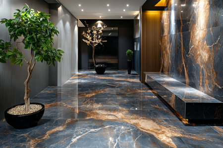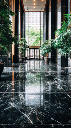 An interior shot reveals a polished black marble floor reflecting light and surrounding elements. Potted plants line the space, adding greenery. The composition includes tall windows showcasing an outside view. The image is suitable for architectural, design, or commercial purposes.