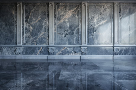Architectural interior background showcasing opulent polished stone wall with dramatic dark gray and metallic gold veining above a white skirting board and reflective marble floor.