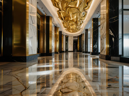 Luxurious hotel lobby featuring white marble with gold veining, brass accents, and elegant lighting. Reflective floors and mirrored surfaces create depth. Modern design blends opulence and sophistication, perfect for high-end hospitality or corporate settings.