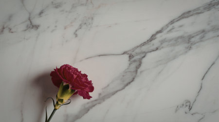 A single pink carnation placed on a white marble surface with gray veins, creating a visually appealing contrast.