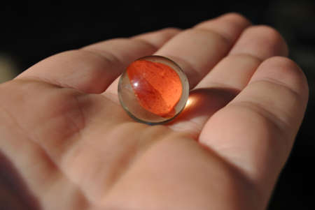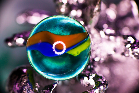 Abstract, blurry background. Fortune telling. Macro shot of glass marble with red, yellow and blue colors in it. Crystal ball is standing on silver, abstract object. Ring light reflection on glass.