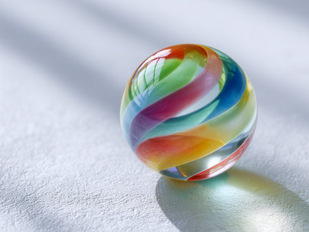 A vibrant glass sphere featuring dynamic rainbow swirls rests on a textured white background, illuminated by gentle natural light that creates a delicate shadow.