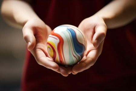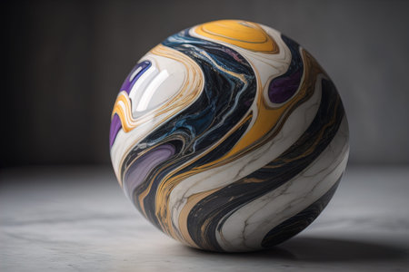Vibrant glass orb with multicolored swirls against white background and playful cartoonish elements
