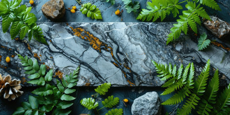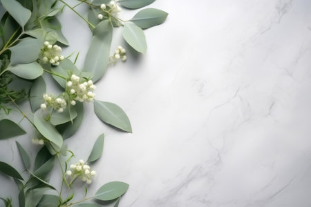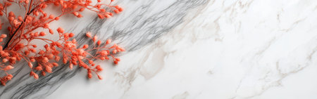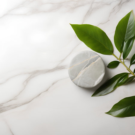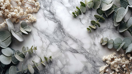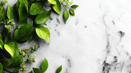 Fresh leaves and blooms rest on a marble surface, capturing the essence of spring with a hint of luxury and natural elements.