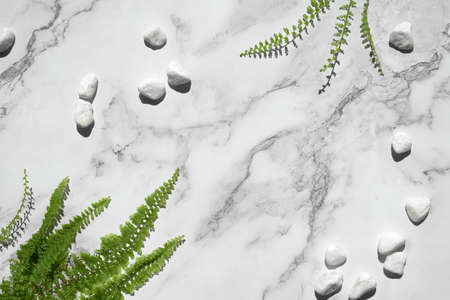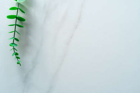 Top view of white tone marble texture abstract background with green natural leaf as frame decoration.