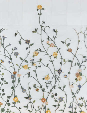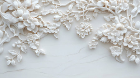 A close-up view of a white wall adorned with intricate floral relief, showcasing a delicate and elegant design.
