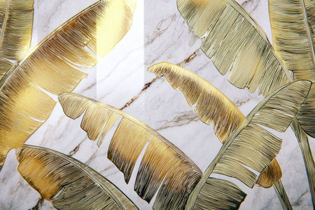Detailed graphic illustration showcases gold leaf banana leaves embossed or rendered on a white marble background. The intricate vein detail of the leaves is highlighted against the textured marble surface. The image creates a visually appealing decorative design with a luxurious aesthetic.
